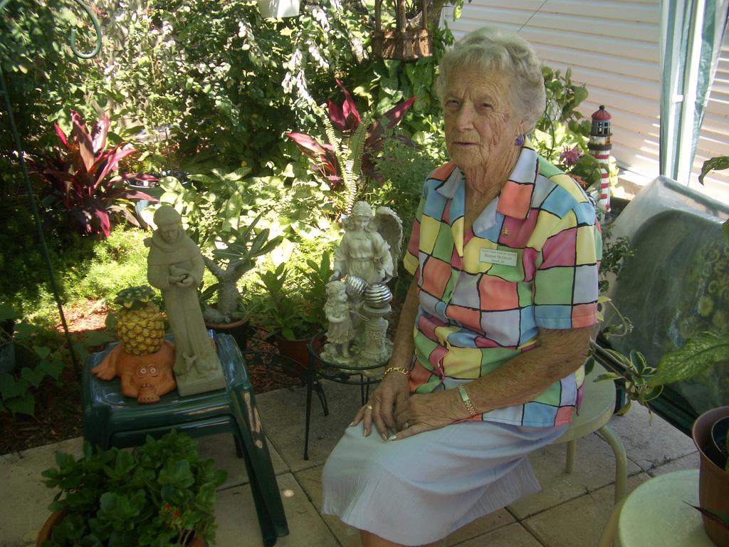 This is Eleanor sitting in her plant area between our properties. It's nice to have a neighbor who has a green thumb. Pat and I certainly enjoy her gardening work.